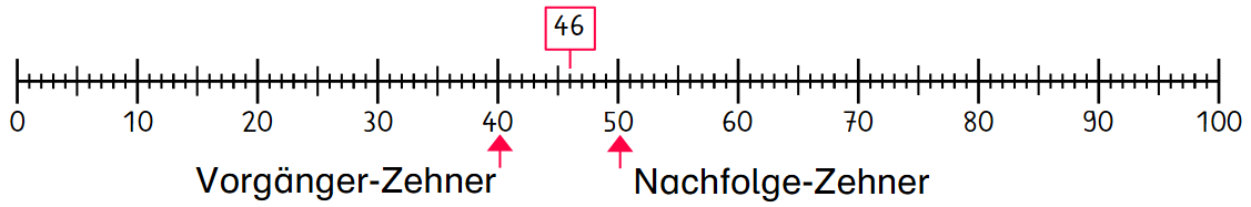 Jede Zahl hat auch einen Nachbarzehner. Doch was ist das, der Nachbarzehner? Am Zahlenstrahl kannst du die Zehnerzahlen ablesen. Es sind die Zahlen: 10, 20, 30, 40, 50, 60, 70, 80, 90 und 100. Suche dir auf dem Zahlenstrahl die Zahl 46. Dann gehe auf dem Zahlenstrahl nach links, bis du zum Vorgänger-Zehner kommst. Es ist die Zahl 40.