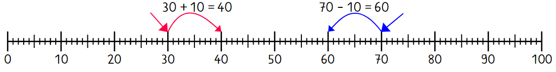 Wir beginnen mit einer kleinen Übung: Gehe am Zahlenstrahl zur Zahl 30. Dann zähle 10 Stiche nach rechts. Bei welcher Zahl bist du angekommen? - Genau, bei der Zahl 40.