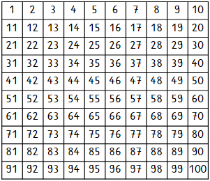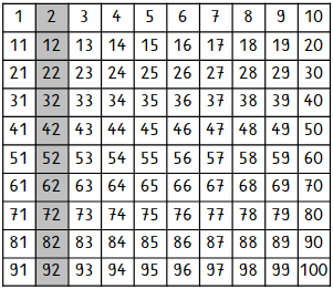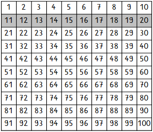 In diesem Hunderterfeld rechts siehst du eine hellgraue Spalte. Alle Zahlen in allen Spalten vergrößern sich nach unten immer um plus 10.